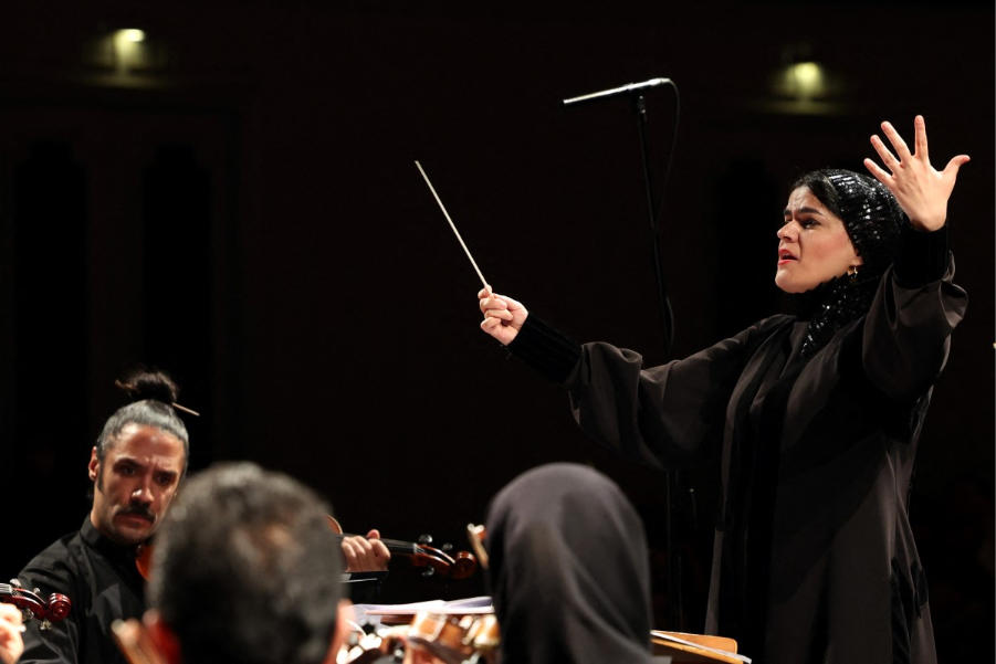 تقف “فريوسفي” أمام نحو 50 عازفاً من الذكور والإناث، وهي تحمل عصاها وترتدي فستاناً طويلاً داكناً وتغطي شعرها بوشاح أسود لامع، بصورة تمتثل لقوانين إيران التي تلزم النساء بوضع الحجاب.